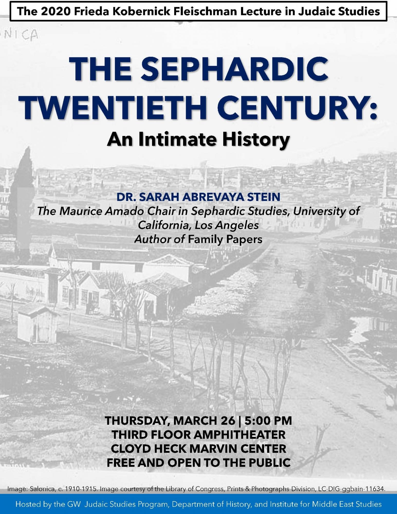 Join us in welcoming Dr. Sarah Abrevaya Stein, who will deliver the 2020 Fleischman Lecture on "The Sephardic Twentieth Century: An Intimate History." Her talk will be based on her recently published book, Family Papers, which details the story of the Levy family of Salonica. Click here for more information about the book.
