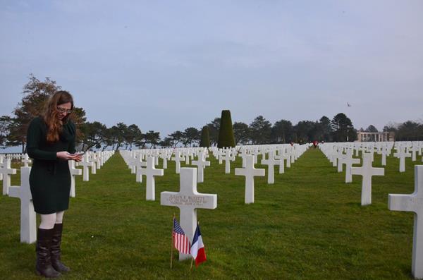 Samantha Lewis, Class of 2017, presents her eulogy for Julian "Rex" Buzzett in the American Cemetery at Omaha Beach on the Normandy coast.